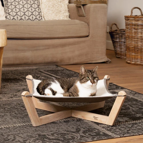 Ist Ihre Katze den ganzen Tag aktiv? Dann braucht sie einen schönen Platz zum Ausruhen. Verwöhnen und überraschen Sie Ihre Katze mit der Hängematte Gaia von Designed By Lotte. Die Hängematte hat Holzbeine. Der Gewebeteil besteht aus weichem Polyestergewebe und Leinengewebe. Das schafft einen schönen weichen Ort. Das Gewebe lässt sich leicht lösen und bei Bedarf bei 30 Grad in der Waschmaschine waschen. Die Hängematte hat auch Schutzfüße für das Holz. Eine durchschnittlich große Hauskatze kann die Hängematte benutzen. Wiegt Ihre Katze etwa 8 kg? Kein Problem dieses Gewicht kann die Hängematte tragen.